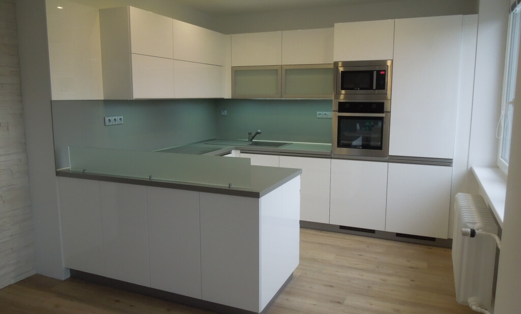 Do kompletně rekonstruovaného bytu jsme dodávali nábytek. Lakovaná kuchyň s velkou pracovní plochou včetně spotřebičů, knihovna do pracovny, ložnice a šatna, předsíňová stěna