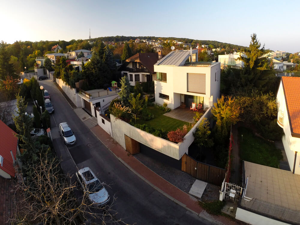 Rodinný dom je situovaný vo svahovitom teréne na úzkom pozemku v husto zastavanej časti mesta. Už tieto podmienky určili prvé mantinely architektúry. Na jednej strane sa z tohto miesta ponúka panoramatický výhľad na mesto, na strane druhej pohľad na zelenú tichú záhradu a ovocné stromy. Dom je rafinovane osadený do svahu tak, aby maximálne využil prednosti a možnosti daného priestoru. Vďaka osadeniu domu ďalej od ulice vznikol vpredu priestor na malú záhradku s výhľadom na mesto. Výškový rozdiel medzi ulicou a úrovňou prvého podlažia je využitý na prístrešok pre autá, prikrytý zeleňou. Týmto sa podarilo vytvoriť jeden súvislý priestor, ktorý sa ťahá od prednej záhrady až do zadnej záhrady. Vďaka preskleným stenám na oboch stranách domu je celý priestor vizuálne prepojený a zeleň sa tak stáva súčasťou interiéru. Ďalším praktickým prvkom sú presahy druhého podlažia, ktoré zabezpečujú prekrytie obidvoch terás a umožňujú tak sedenie vonku za akéhokoľvek počasia. Okrem toho slúžia aj ako efektívne tienenie zasklených plôch, ktoré tak v lete neprehrievajú interiér. Centrom každodenného života je obývačka s originálnym kozubom. Klient mal jasnú predstavu o priestorovom členení interiéru, ktorý je nadčasový, vzdušný a príjemný. Na prvom podlaží sa nachádza obývačka, kuchyňa a jedáleň, pričom je celý priestor prirodzene prepojený s pohľadmi na prednú a zadnú zelenú záhradu. Na druhom podlaží sa nachádzajú spálne, dve detské izby s výhľadom na mesto a rodičovská spálňa s výhľadom do záhrady. Na najvyššej úrovni domu sa nachádza ešte jedna strešná záhrada s panoramatickým výhľadom na mesto, na ktorú sa dostanete popri malej súkromnej pracovni. Schodisko je ďalším výrazným prvkom tohto domu, tiahne sa odspodu nahor, pričom namiesto zábradlia sú použité praktické nábytkové kubusy. Architektúra rodinného domu vznikala prirodzene. Základom bol priestorový koncept interiéru a tiež zohľadnenie svetelných a výškových možností pozemku. Výsledkom je nadčasový domov, z ktorého priam srší pohoda komfortného rodinného života. Fotograf: Tomáš Manina