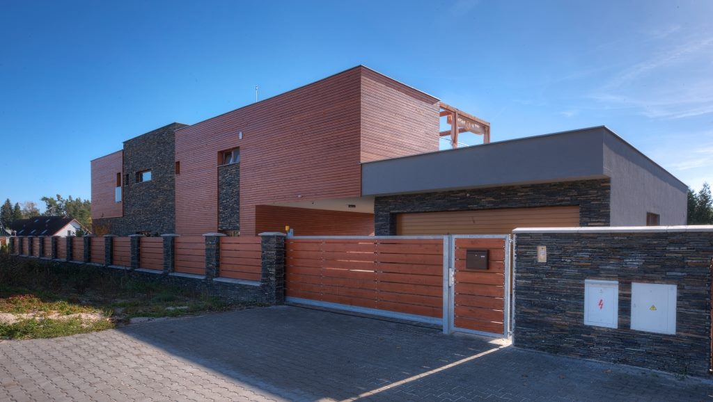 RD Hradec Králové Realizace fasády rodinného domu v kombinaci fasádního systému FUTURESTONE - model Desiree Dark z přírodního štípaného kamene a obkladu ze sibiřského modřínu. V tomto případě se prováděla i realizace plotů. Fasádu krásně doplňuje skleněné zábradlí, které svým vzhledem nijak neruší celkový vzhled.