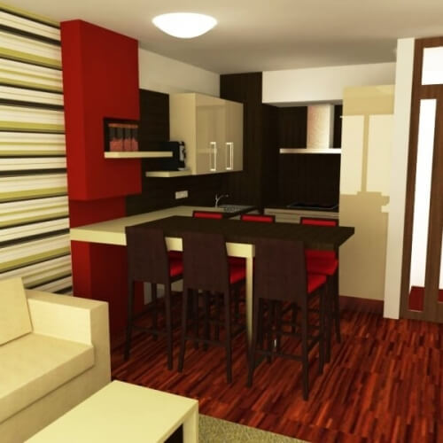 Obývací pokoj s kuchyní v bytě 2+kk byl již částečně zařízený. Majitelé si přáli prodloužení a úpravu stávající kuchyňské linky a optické oddělení kuchyně od obývací části.