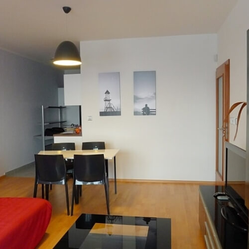 Byt v novostavbě developerského projektu byl provizorně zařízen pouze několika kusy nábytku.