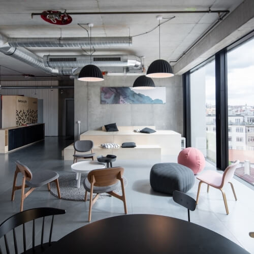 Concept / colors / materials - Great emphasis was placed on preserving and enhancing the qualities of the space as such. That is clarity, variability, brightness and airiness. The basic elements: concrete on the ceiling and load-bearing structures, glass facade, installations and metal floor tiles, thus remained without significant changes, on the contrary, their character was underlined. In contrast to predominantly industrial materials, finer organic materials based on textile and wood were also chosen in the design. Oak plywood was used at the stage, welcome wall and cloakroom. Light textile was used in order to achieve the highest possible optical and acoustic comfort for continuous work. The division of the space with the help of textiles also made it possible to work with round shapes inside the space, which again underlines the organic character of the interior. Lighting and other accessories are designed in white or anthracite color, which draws no significant attention to itself, but conversely contributes to the overall harmony.