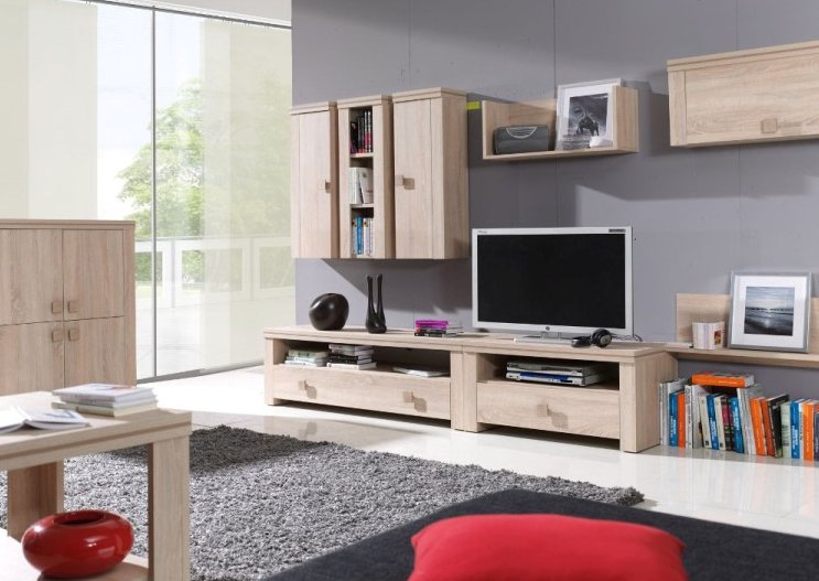 Prostorná obývací stěna s mnoha jednotlivými díly, vhodná do větších interiérů. Kvalitní lamino ze kterého je nábytek vyroben je dostatečně odolné a dokonale imituje strukturu dřeva. Obývací sestava obsahuje komodu, dva televizní stolky s šuplíky, závěsné skříňky rozličných variací, závěsné police a konferenčí stolek. Sestava je dodávána v několika barevných provedeních.