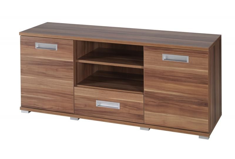Televizní stolík se dvěma bočními skříňkami po stranách. Stolek lze využít také jako klasickou komodu na úschovu oblečení a podobně. Otevřený prostor s policí je vhodný na uložení přídavné elektroniky k televizoru. Vrchní deska je dostatečně silná a díky vyztužení odolá vysokému zatížení starších modelů televizí. TV stolek je opatřen zapuštěnými úchytkami, jsou více praktické než klasické vyčnívající ručky. Na obrázku je vyobrazen dekor švestka, ten je opatřen výraznou strukturou dřeva, které je pro zákazníky velice atraktivní. Použitý materiál je vysoce pevný díky zpracování, zajistí dlouhou životnost a barevnou stálost po celou dobu užívání.
