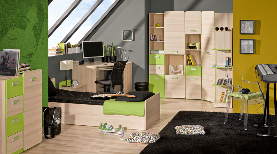 Dvoubarevný dětský pokoj Bambi 8 je v tomto barevném provedení uzpůsoben spíše pro starší děti. Kombinací barev lze z pokojíčku vytvořit pestrobarevný svět na hraní. Takto skombinovaná sestava je vhodná pro jedno dítě. Díky možnosti dokoupení jiných komponentů z řady Bambi upravíte pokojík pro dva sourozence. Nábytek Bambi 8 obsahuje kombinovanou komodu s šuplíky, jednolůžkovou postel s úložným prostorem, noční stolek s šuplíkem, rohový psací stůl s velkou pracovní plochou, dětskou skříň na oděvy, objemnou rohovou šatní skříň a dvě knihovny. Na výrobu nábytku byl použit odolný LTD materiál, který nejen že je dostatečně tvrdý, ale také se snadno udržuje a neztrácí své barevné provedení. Jednotlivé díly mají zaoblené tvary, což působí propracovaným dojmem. Výrobce dbá na kvalitní zpracování, které je patrné při detailním pohledu.
