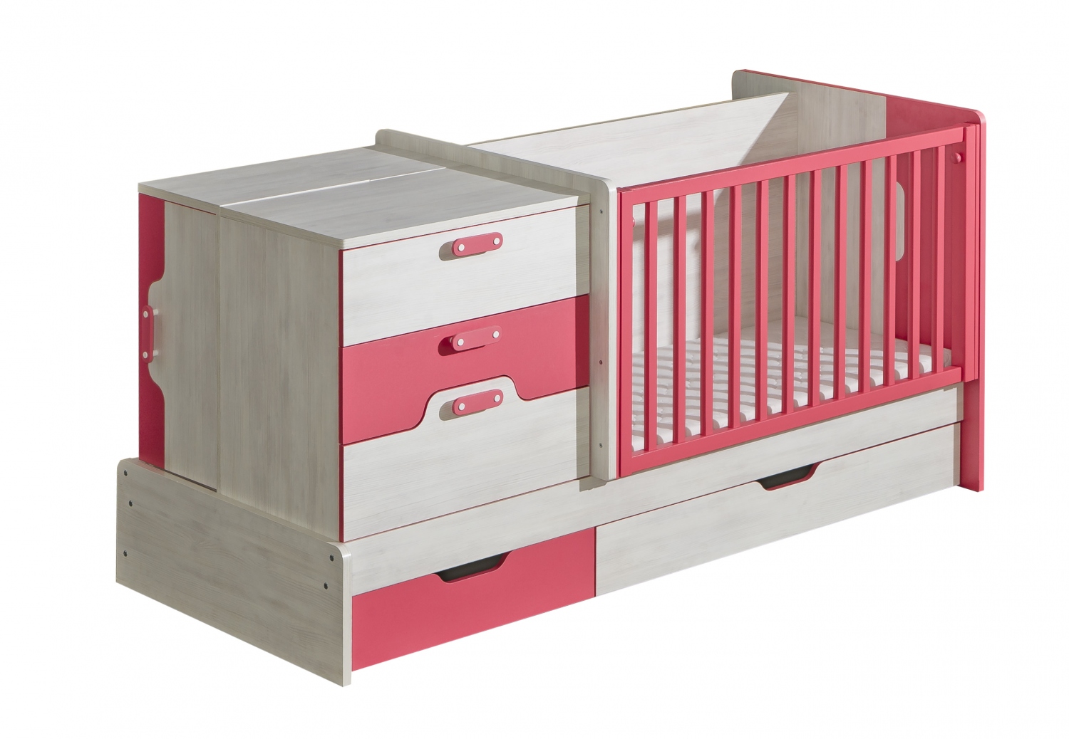 Další výhodou je možnost vyjmutí zábrany a samozřejmě také možnost rozložení na jednotlivé komponenty, díky čemuž získáte dětskou postel, psací stůl s kontejnerem, 2 police a šuplíkovou komodu, které můžete v pokojíčku libovolně rozmístit. Postýlku nabízíme ve 2 variantách barevného provedení, aby ji šlo zakomponovat do dětského pokoje pro chlapečka i pro holčičku. Přírodní dekor norská borovice lze kombinovat s malinovým nebo modrým odstínem.