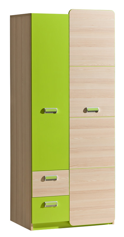 Šatní skříň je precizně zpracovaná do posledního detailu. LTD materiál zajistí skříni potřebnou stabilitu a odolnost vůči vnějším vlivům. Navíc je skříň plně omyvatelná. Korpus a část přední strany je v barevném provedení jasan s prvky v zelené nebo fialové barvě.