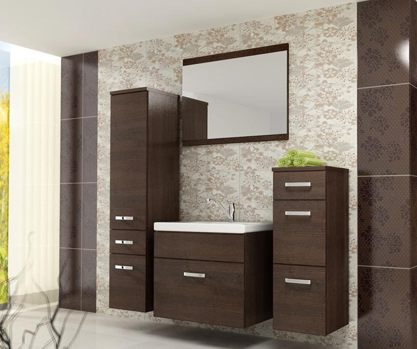 Sestavu tvoří 3 koupelnové skříňky pro uschování osušek, kosmetiky a jiných hygienických potřeb, zrcadlo využijete při úpravě zevnějšku. Snadnou manipulaci umožňují masivní úchyty, vkusně kontrastující s tmavým odstínem wenge. Na výrobu jednotlivých komponentů bylo použito lamino, mezi jehož žádoucí vlastnosti patří pevnost a vysoká odolnost vůči oděru, vlhkosti a plísním.
