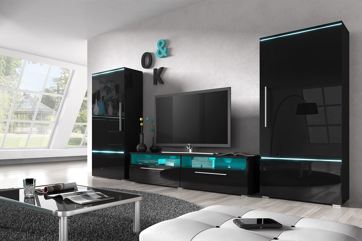 Materiál lamina, z kterého je obývací stěna zhotovena, se vyznačuje barevnou a tvarovou stálostí a snadno se udržuje v čistotě. Sestava je odolná proti oděru a poškrábání a také proti vlhkosti. K obývací stěně lze doobjednat LED osvětlení s ovládáním, na kterém si můžete navolit nejen intenzitu a ostrost světla, ale barevné odstíny, což umožňuje až šestnáct světelných efektů. Navíc si vyberete ze tří barevných provedení (stejný design i ve vnitřních prostorech). Komoda Kolby lze koupit i samostatně zde.