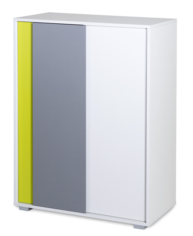 O komodě Minela se dá s jistotou říci, že splňuje jak estetické tak praktické požadavky. Univerzální kombinace bílé a šedé je doplněna ozdobným páskem v barvě limetky. Uvnitř naleznete tři police, které vytvoří dostatek prostoru k šetrnému uložení prádla. Celkový vzhled okoření čtyři hranolové nožky, které navíc zajišťují potřebnou stabilitu.