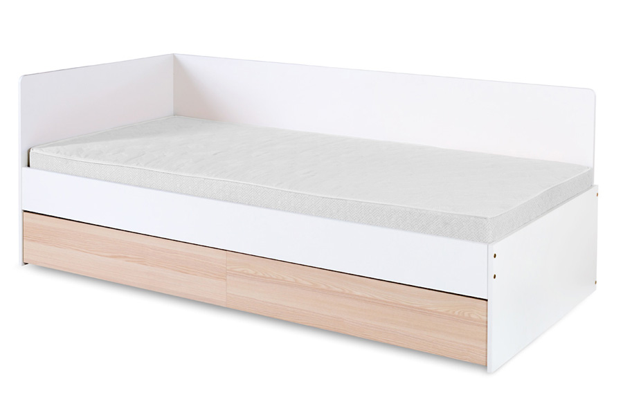 Součástí postele je nejen pevný rošt, ale také zabudovaný úložný prostor. Ten má podobu široké zásuvky a lze jej využít pro uskladnění ložního prádla, ale také poklizení hraček, které se nyní jen tak povalují po pokoji. Vyvýšené čelo společně s bočnicí stačí opatřit velkými polštáři a rázem z klasické postele vytvoříte zajímavou dětskou pohovku.