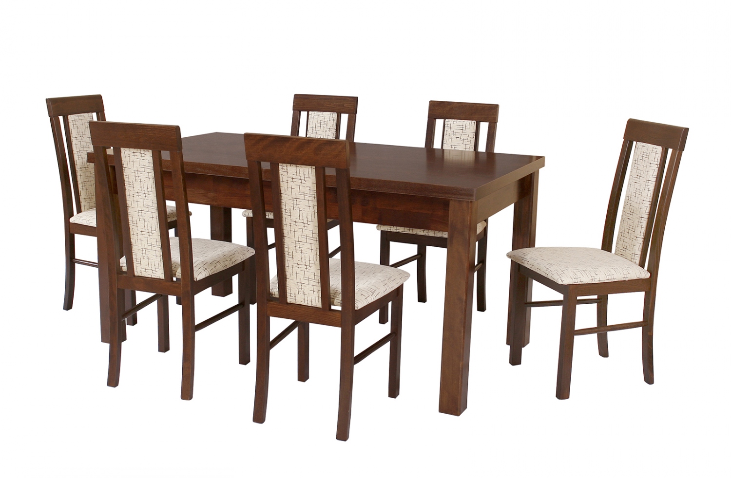 Klasická jídelní sestava je vyrobena z bukového masivu (deska stolu je z přírodní dýhy). Set zahrnuje šest židlí a jídelní stůl, který je rozkládací na plochu o rozměrech 200 x 90 cm. Díky němu se u něho pohodlně nají až šest lidí. Kvalitní dřevěná konstrukce dodává nábytku pevnost, stabilitu a možnost dlouhodobého využití.