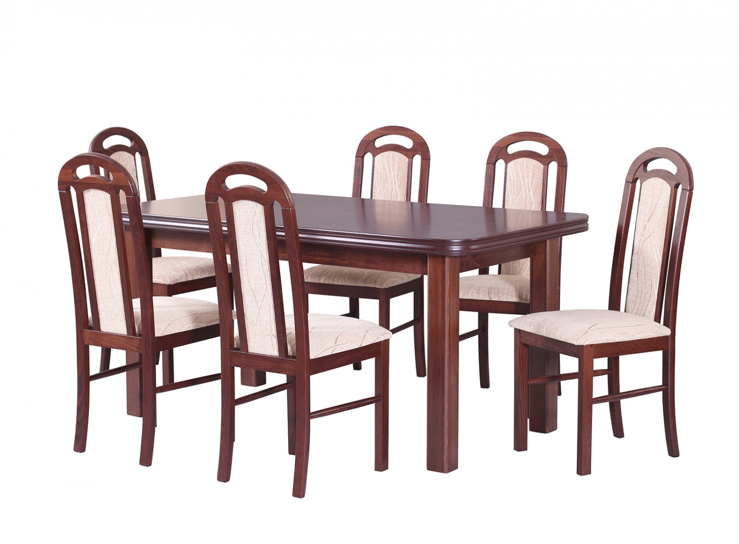 Nábytek je vyroben z bukového masivu, deska stolu je z přírodní dýhy. Sedák židlí je vyroben z polyuretanové pěny, očalouněné odolnou látkou nebo ekokůží, podle toho, jaký materiál si zvolíte. Polstrování v opěrné části zajišťuje vysoký komfort při sezení.