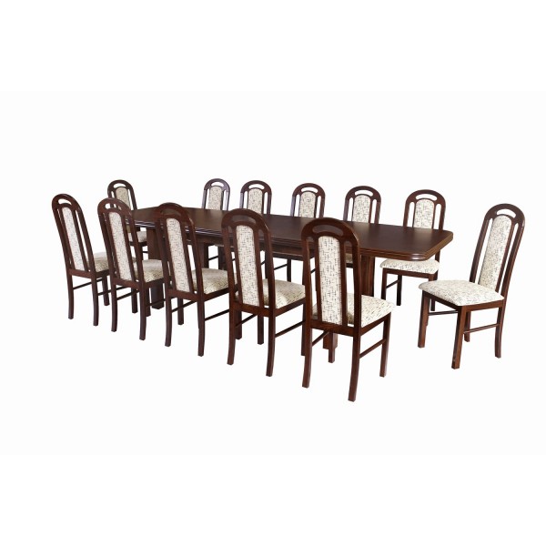 Elegantní jídelní set Radoslav pro 12 osob vyniká moderním účelným designem, zaoblené linie umocní pocit útulnosti místnosti. Zahrnuje velký rozkládací stůl a 12 komfortních kvalitně polstrovaných židlí. Moření si můžete zvolit z výše uvedené nabídky, stejně jako polstrování z rozsáhlého výběru potahových látek.
