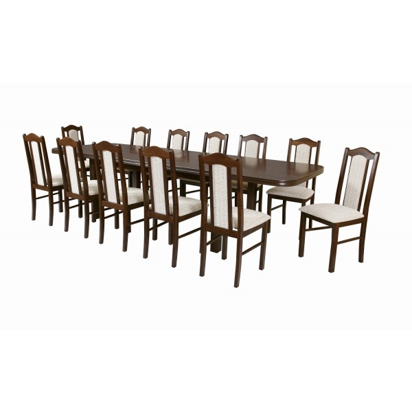 Jídelní set z výběrového masivu bukového dřeva (deska stolu je z přírodní dýhy) zahrnuje velký rozkládací jídelní stůl a dvanáct pohodlných polstrovaných jídelních židlí. Zaoblené tvary působí velmi elegantně. Pevná konstrukce činí nábytek stabilním a odolným vůči mechanickému poškození, několikavrstvé povrchové ošetření zdravotně nezávadným lakem poskytuje ochranu proti oděru a opotřebení.