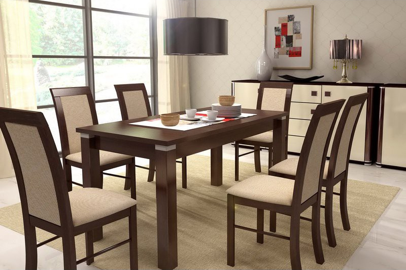 Tato sestava zahrnuje praktický rozkládací jídelní stůl a šest čalouněných židlí, jejichž komfort zajišťuje polstrování sedací a opěrné části. Jídelní stůl je možné pomocí vsuvky do středové části rozložit až na délku 200 cm.