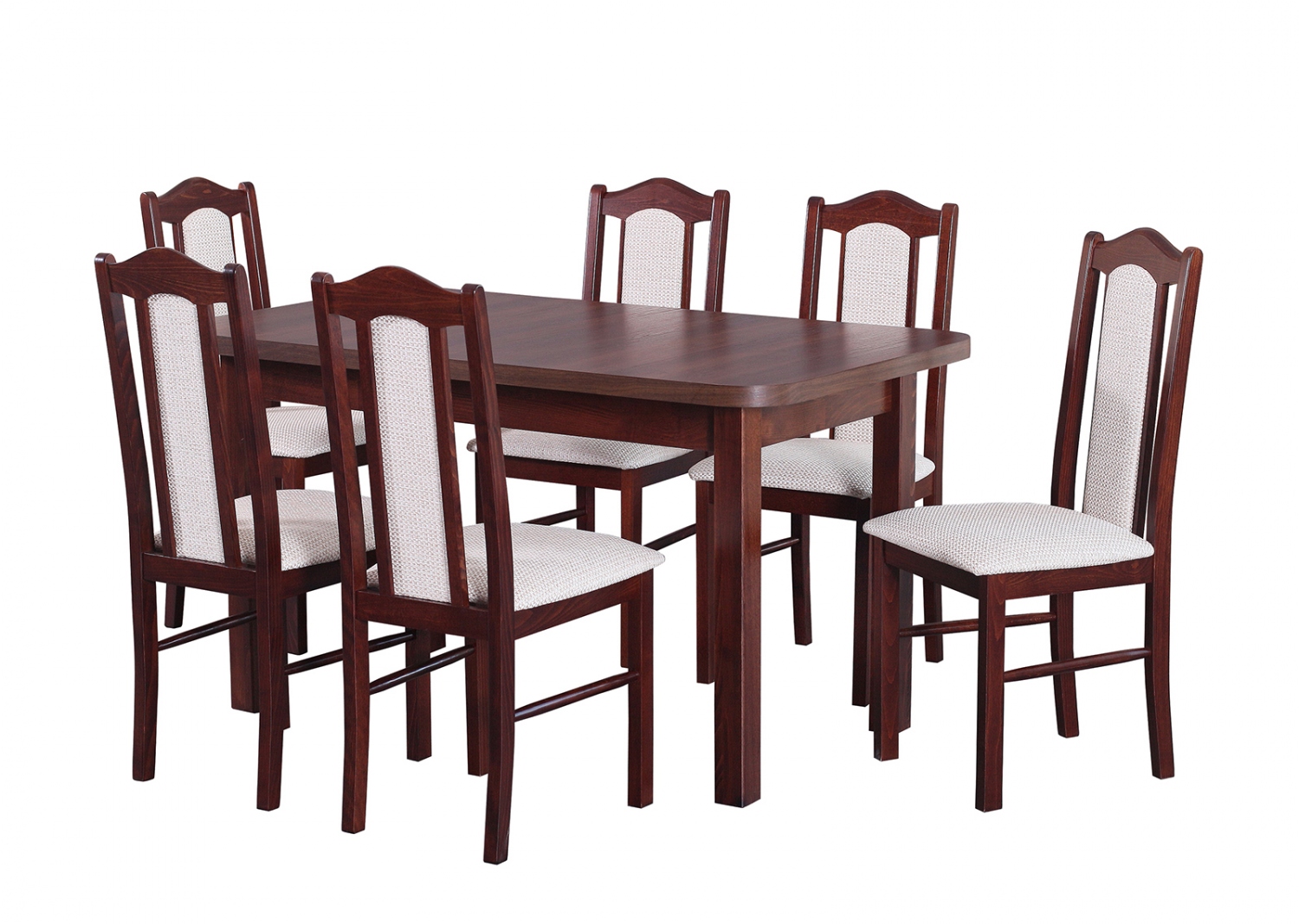 Dopřejte si pohodlí při stolování a do vašeho jídelního koutu nebo kuchyně si pořiďte jídelní set Ruben pro 6 osob. Jídelní set na první pohled zaujme elegantními zaoblenými tvary a netradičním tvarem opěradla. Součástí sestavy je rozkládací jídelní stůl a šest čalouněných jídelních židlí.