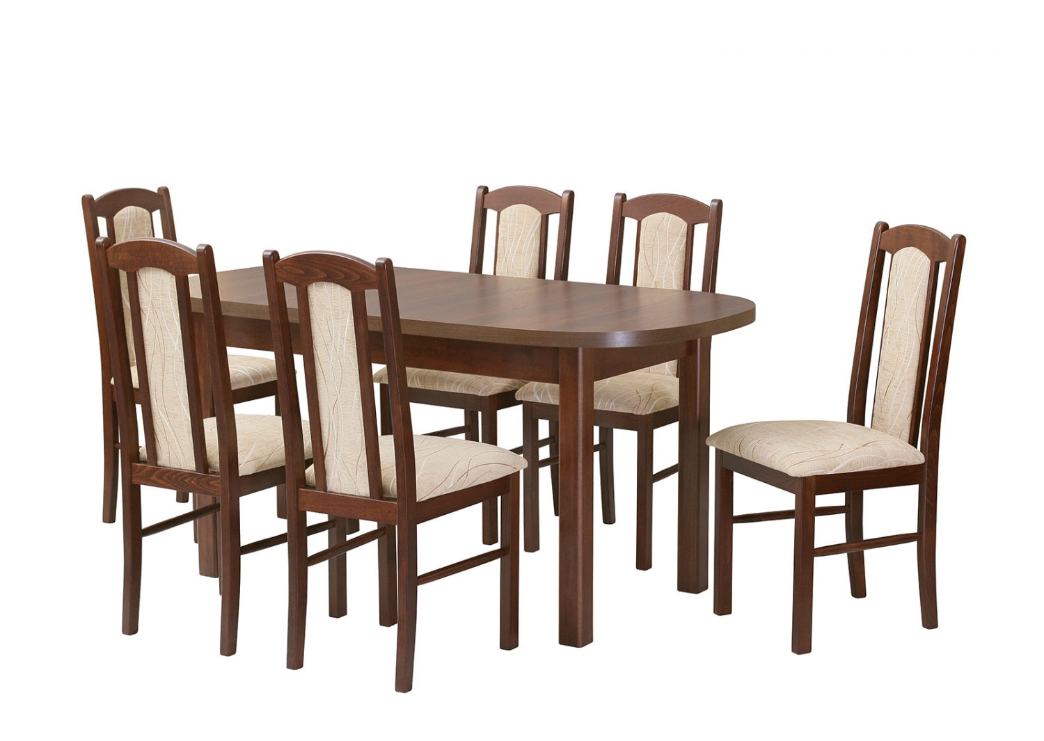 Dřevěný jídelní set Tulius pro 6 osob je vhodný do rustikálnějšího nebo klasičtějšího interiéru. Polstrování opěrné a sedací části dodává židlím dostatečný komfort při sezení. Stůl je rozložitelný a pohodlně se k němu usadí až 8 lidí. Větší návštěva už nebude problém.