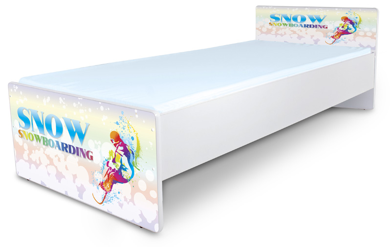Dětská jednolůžková postel s motivem Snowboard zaujme všechny milovníky sněhu a tohoto adrenalinového sportu. Dynamiku vyobrazení zjemňuje bílý korpus postele a pastelové odstíny, díky nimž dekor působí velmi harmonicky, což postel činí ideálním místem k načerpání energie nejen pro freestyle disciplíny. Zásluhou použitých HDF desek je dětský nábytek vysoce odolný vůči mechanickému poškození.