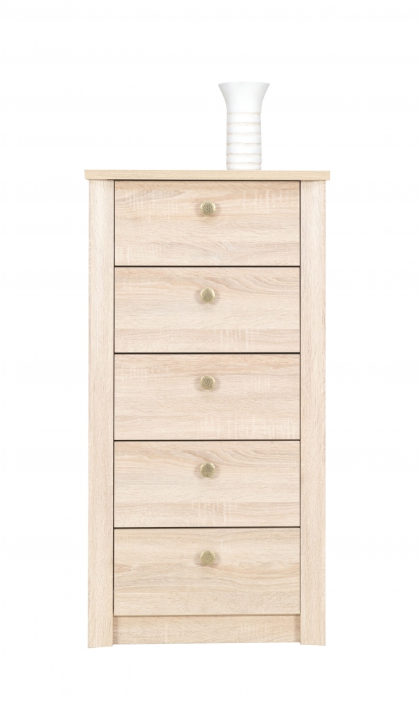 Šuplíková komoda vyrobená z odolného lamina je díky čistým liniím a neutrálnímu barevnému provedení vhodná do každého interiéru. Umístit ji můžete do předsíně, ložnice, pokoje pro hosty i dětského pokoje. Pět dostatečně prostorných a ideálně hlubokých šuplíků můžete využít na uložení prádla či módních doplňků, ale také k uschování hraček.