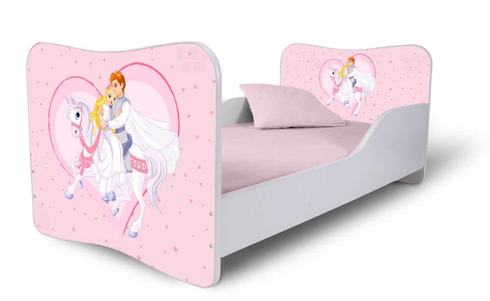 Barevný obrázek na obou čelech postele s motivem princezny a princem na jednorožci je chráněn vrstvami průhledného laminátu. Máte na výběr ze tří rozměrů ložné plochy.
