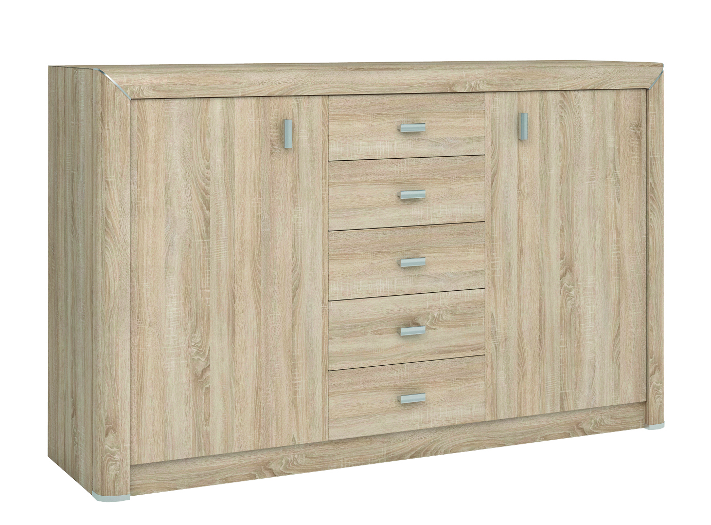 Úložný prostor je tvořen pěti zásuvkami uprostřed a dvěma bočními skříňkami obsahující vložené police. Komoda je dostupná ve světlém dekoru dub sonoma s charakteristickou kresbou, skvěle se tedy bude hodit i k výraznějším doplňkům.