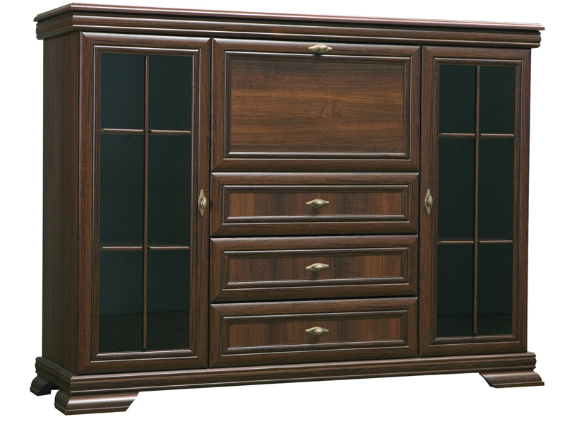 Ve třech zásuvkách najdou své místo věci, které by měly být před návštěvou skryty, naopak prosklené boční vitríny nabízejí místo pro přehlídku vzácného skla či starožitných dekorací. V horní skříňce s vyklápěcími dvířky by mohl být malý bar připravený k pohoštění návštěvy.
