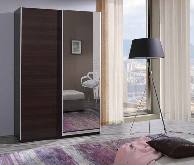 Nadčasový design šatní skříně s posuvnými dveřmi vynikne v každé moderní ložnici. Díky ní bude každý kousek prádla na svém místě a místnost bude působit uklizeným dojmem. Zákazník si může zvolit variantu šatní skříně se zrcadlem nebo bez něj. Zajímavým prvkem jsou kovové lišty lemující skříň.