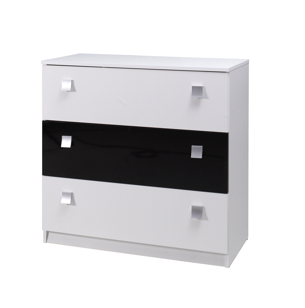 Moderní šuplíková komoda je ideální například pro umístění do ložnice, kde ji lze využít k uschování drobného oblečení nebo spodního prádla. Optimální výška horní desky umožňuje vystavení dekorací, květin nebo oblíbených rodinných fotek. Kořením neutrálního bílého provedení je prostřední zásuvka v černém lesku. Na pohled zajímavým a funkčním detailem jsou originální úchyty pro snadný přístup k úložnému prostoru.