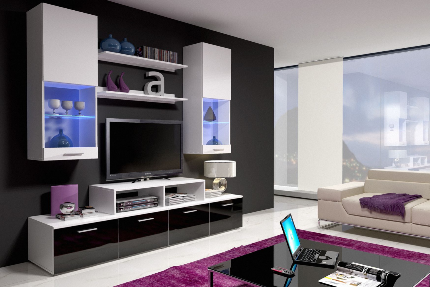 Součástí sestavy jsou dvě závěsné vitríny, dva televizní stolky s jedním nádstavcem a dvě police. Částečně prosklené vitríny tvoří tři police, které dodržují stejný materiál jako jejich dvířka. Televizní stolky jsou každý tvořen dvěma skříňkami s výklopnými dvířky a jedním nádstavcem s otevřenými policemi. Všechny prosklené části mají zabudované LED osvětlení.