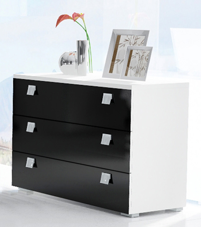 Možnost výběru ze 3 variant barevného provedení umožňuje zvolit si takovou kombinaci odstínů, která ideálně zapadne do celkového barevného pojetí místnosti. Čela zásuvek jsou vyhotovena v lesku, který umocňuje celkový moderní vzhled nábytku. Pevný použitý výrobní materiál (kombinace MDF a DTD desek) vyniká také nenáročnými požadavky na povrchovou údržbu.