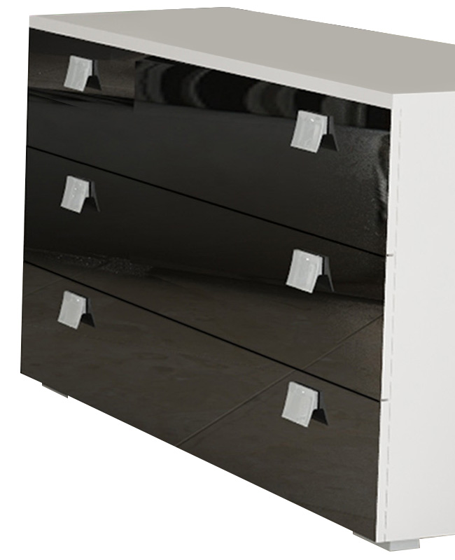 Úložný prostor nabízí 3 pod sebou umístěné výsuvné šuplíky, snadný přístup k uschovaným předmětům umožňují zajímavě řešené úchyty. Optimální výška horní desky umožňuje vystavení oblíbených rodinných fotografií, dekorací nebo umístění květin. Komodu nabízíme ve 3 variantách barevného provedení, v kombinacích bílá / šedá, bílá / černá a bílá / fialová. Oživujícím prvkem jsou přední části v lesku.