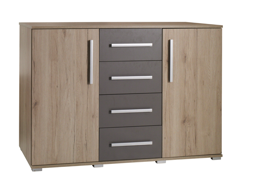 Je úložná kapacita vaší šatní skříně nedostatečná, ale nechcete prostor zahltit pořízením další skříně? Jako chytré řešení se nabízí zakoupení praktické komody. Do interiéru laděného do přírodních odstínů skvěle zapadne komoda Darien, tvořená 4 pod sebou umístěnými zásuvkami a bočními skříňkami s vloženou policí. Součástí dvířek i čel šuplíků jsou podlouhlé úchyty, barevně ladící s nízkými podpůrnými nožkami ve spodní části.