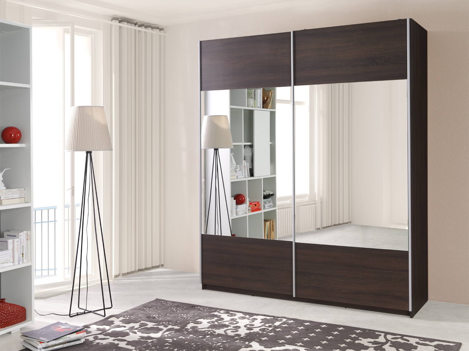 Skříň je uvnitř rozdělena na policovou část se čtyřmi vloženými policemi a na prostor s šatní tyčí, horní a dolní policí. Můžete tak do ní ukládat šatstvo poskládané do komínků i oblečení z mačkavých materiálů, které potřebují zavěsit na ramínka. Na obou posuvných dveřích jsou umístěna dvě velká zrcadla pro úpravu zevnějšku, která opticky zvětšují prostor místnosti.