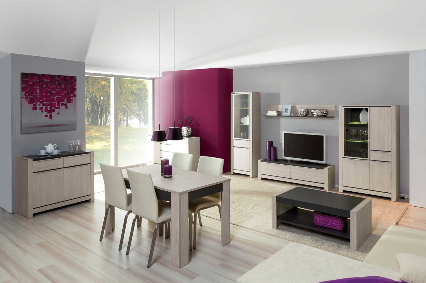 Současné trendy přejí propojování obývací a jídelní části v jeden velkoryse koncipovaný, otevřený prostor. Jestliže si objednáte elegantní sestavu Emílio, můžete se spolehnout, že získáte maximálně stylovou multifunkční místnost. Stačí se podívat na ilustrační fotografii, z níž je patrno, že díky nadčasovému designu a univerzálně kombinovatelnému odstínu borovice avola nepůsobí televizní stolek v blízkosti stolu jídelního ani v nejmenším nevhodně či nepatřičně. Současný moderní vzhled dodává sestavě ozvláštňující kontrastní grafitové prvky.