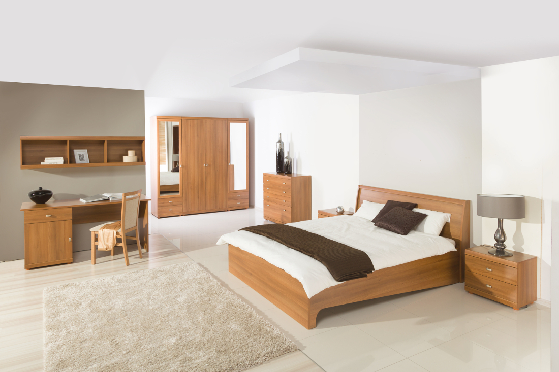 V jednom kroku, jen zásluhou pár nenamáhavých kliknutí, můžete získat kompletní zařízení ložnice včetně pracovního koutu. Veškeré nábytkové komponenty jsou v jednotném odstínu (buď třešně malagy či akácie královské), z odolného a kvalitního LTD. Součástí sestavy Madelin je i laťkový rošt k manželskému dvoulůžku (matraci o rozměrech 140x200 cm či 160x200 cm si však vyberte zvlášť, dle vašich preferencí na tvrdost či materiál) a čalouněná židle u psacího stolu.