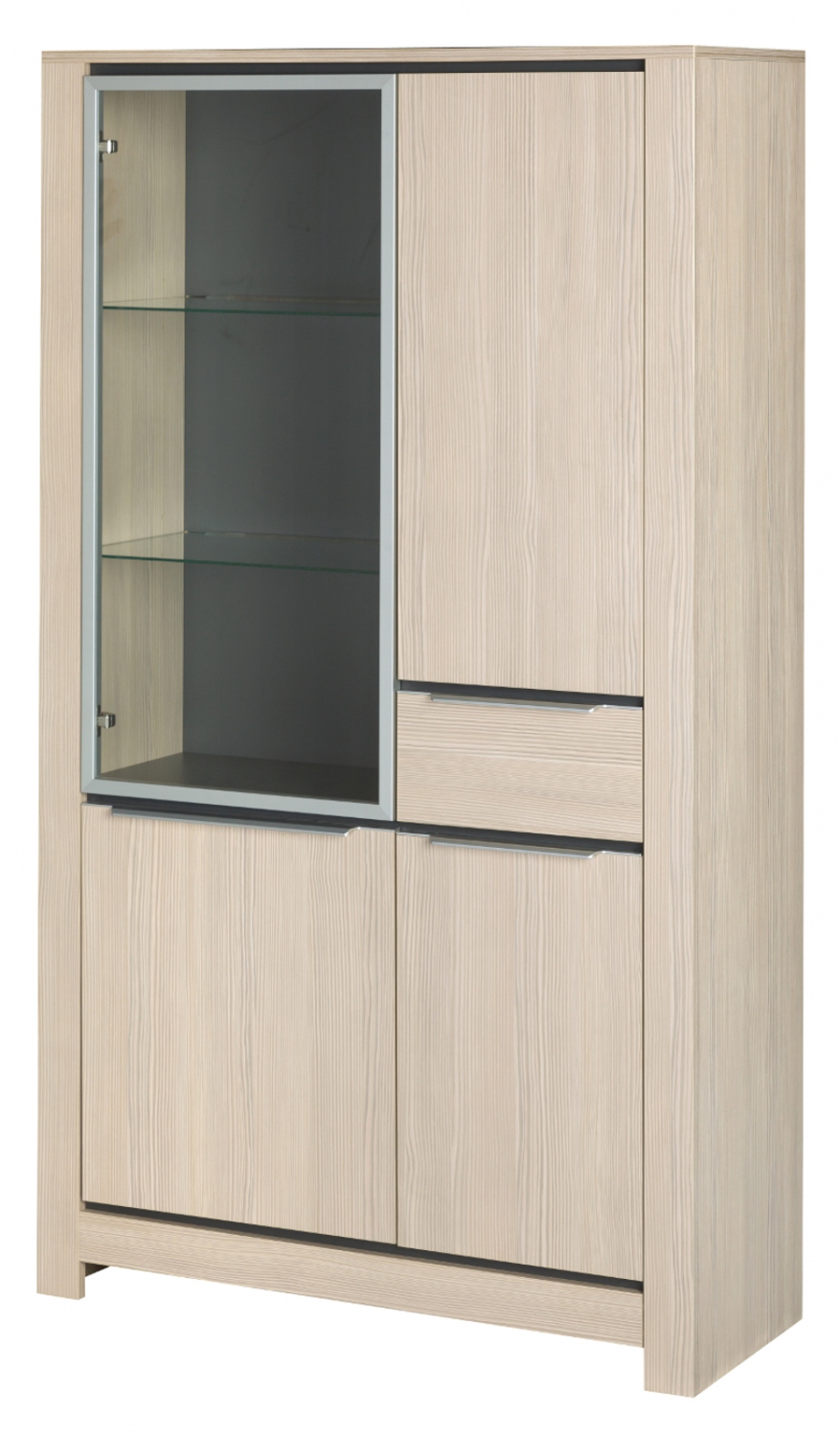 Vitrína disponuje různorodým úložným prostorem v podobě spodní dvoudveřové skříňky s vloženými policemi, jedním šuplíkem malou horní skříňkou s policemi a vitrínou se skleněnými policemi. Skleněné části jsou z tvrzeného skla, rámování prosklené části je z hliníku. Panty jsou kovové. Rozložení úložného prostoru společně s nosnostmi polic si můžete prohlédnout na přídavném obrázku. Šuplík je vybaven systémem Quadro s tichým dovíráním.