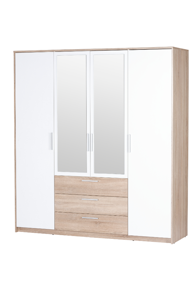 Jednou z nich je 4-dveřová šatní skříň se zrcadlem Rebeka, jenž zásluhou bílého provedení kombinovaného s přírodním dekorem dub sonoma ideálně zapadne do interiéru ložnice. Velkorysý úložný prostor poskytuje dostatek místa na šaty vyžadující zavěšení, složené svetry a trička a dokonce i na úschovu spodního prádla či drobných módních doplňků.