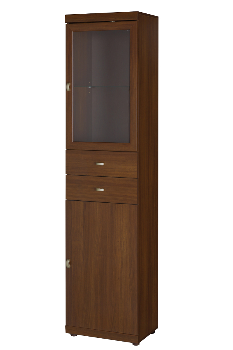 Úzká prosklená vitrína si jistě zaslouží místo ve vašem obývacím pokoji, kde vám poslouží nejen k vystavení oblíbených dekorací, ale také k úschově rodinných fotografií nebo důležitých písemností. Horní část se skleněnou výplní z čirého tvrzeného skla je vybavena skleněnou policí o nosnosti do 15 kg. Pod ní jsou umístěny 2 zásuvky a nosnosti do 4 kg, spodní skříňka je vybavena vloženou policí o nosnosti do 20 kg (přesné rozmístění jednotlivých prvků si můžete prohlédnout na přiloženém nákresu).