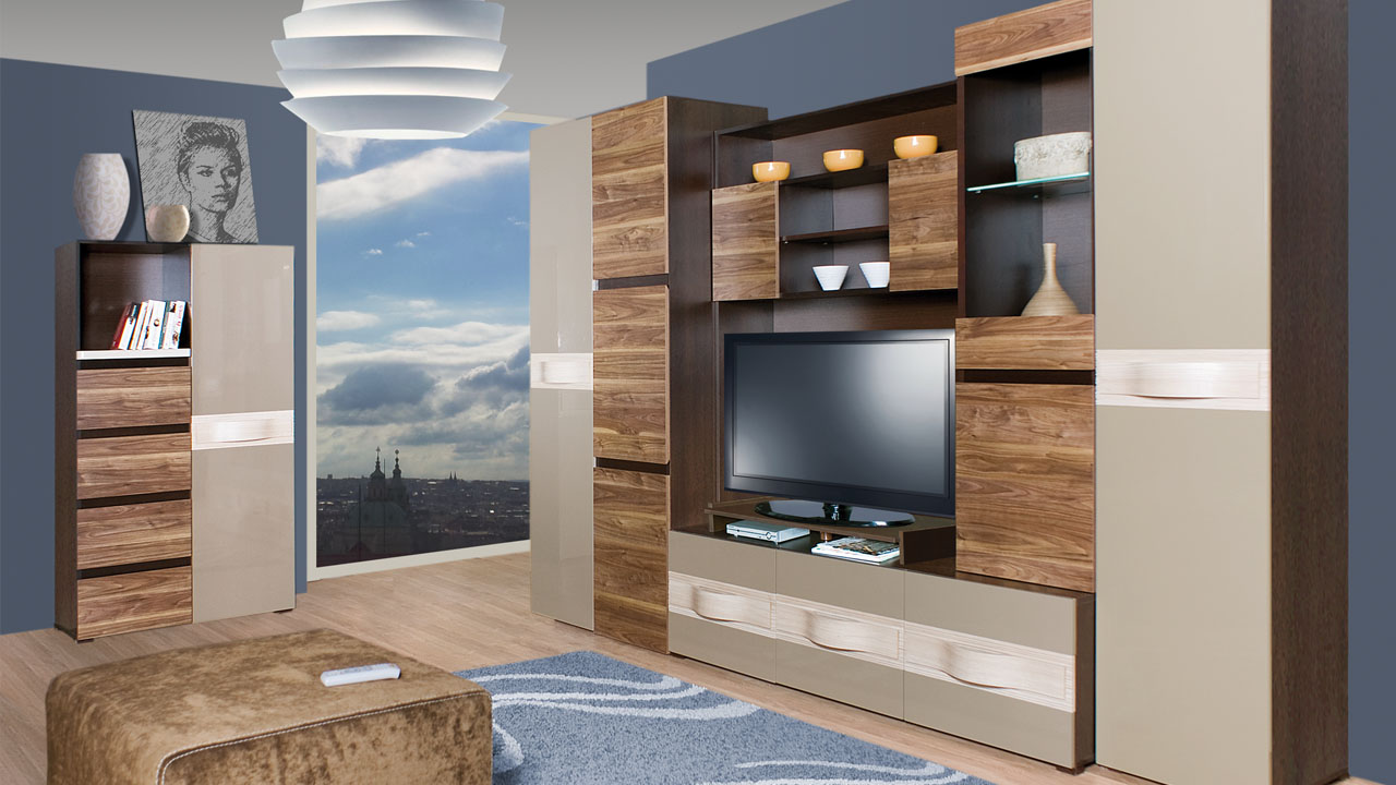 Moderní obývací stěna Esperanza 1 reflektuje současné nábytkářské trendy, aniž by však byla její stylovost vykoupena absencí funkčnosti a praktičnosti. Na rozdíl od své "sestry" Esperanzy 2 poskytuje více úložných prostor, neboť namísto jednoduché nástěnné poličky nabízí prostornou závěsnou skříňku s poličkami i plnými dvířky, jež je přímo napojena na nízký televizní stolek. Televizní nástavec, stejně jako samostatně stojící komoda i LED osvětlení otevřených polic, je již zahrnuto v ceně obývací stěny.