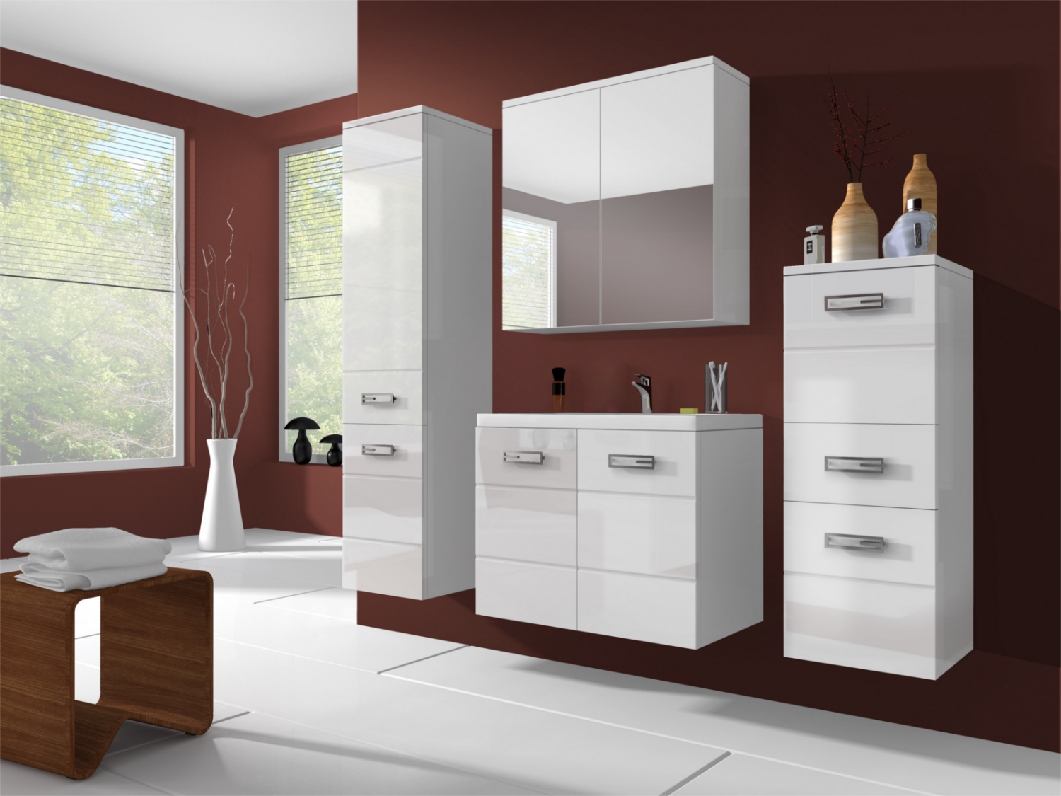Sestava obsahuje čtyři praktické komponenty, vyrobené z kvalitního lamina. Tento materiál se vyznačuje vysokou odolností vůči oděru i vlhkosti a zaručena je tak dlouhodobá tvarová i barevná neměnnost. Nadčasová bílá barva, ve které je nábytek vyveden, nikdy nezestárne. Skříňka pod umyvadlo je dostupná ve variantě s umyvadlem nebo bez umyvadla.
