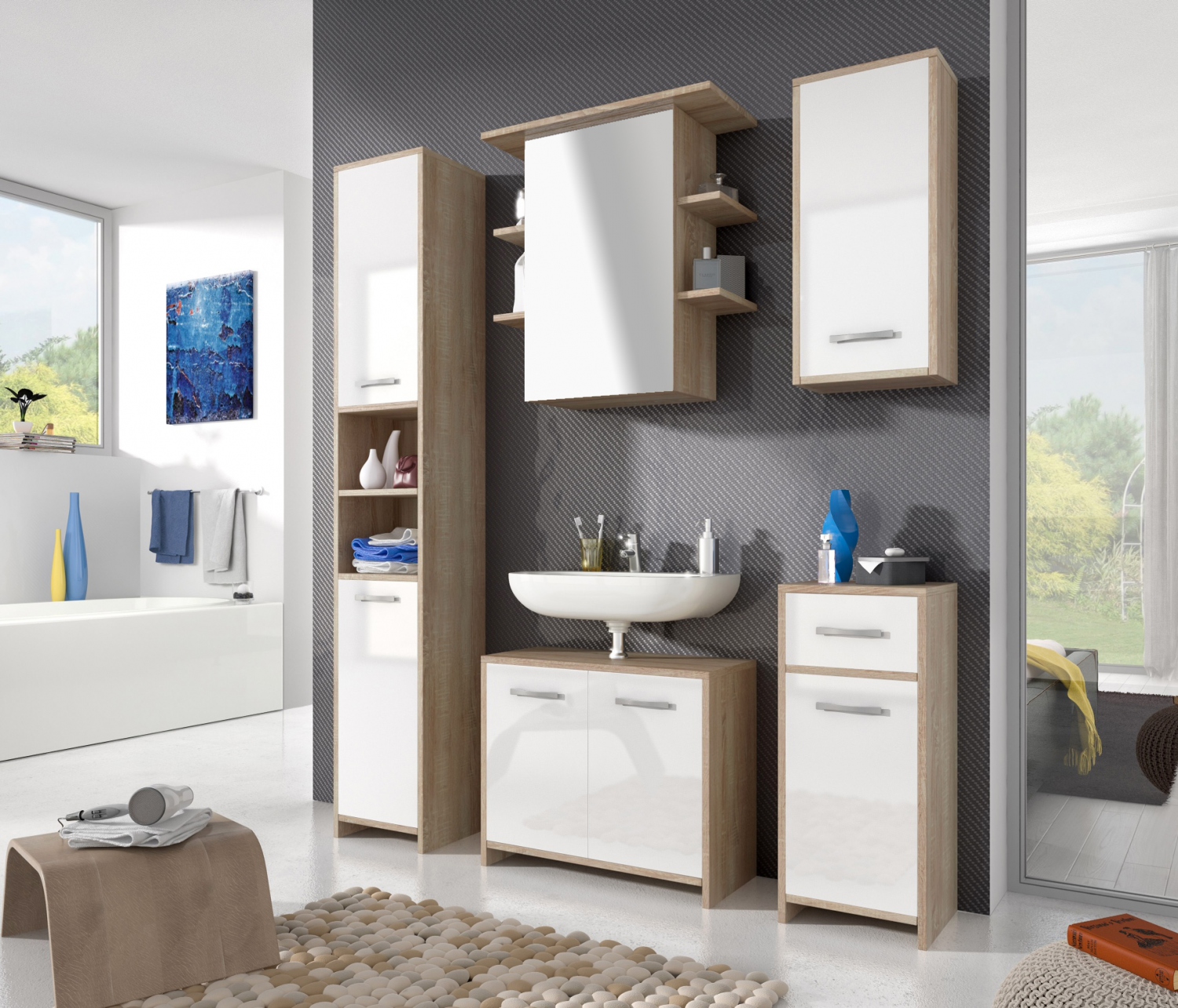 Chybí již vaší koupelně šmrnc a vy byste jí rádi dodali nový mladistvý vzhled? Se sestavou moderního koupelnového nábytku Arion 5 se vám to podaří a navíc za skvělou cenu. Koupelnová sestava je designována v dnešní době velmi žádané kombinaci přírodního dekoru dub sonoma s prvky v bílém lesku. Jde o atraktivní provedení, které zútulní každou koupelnu.