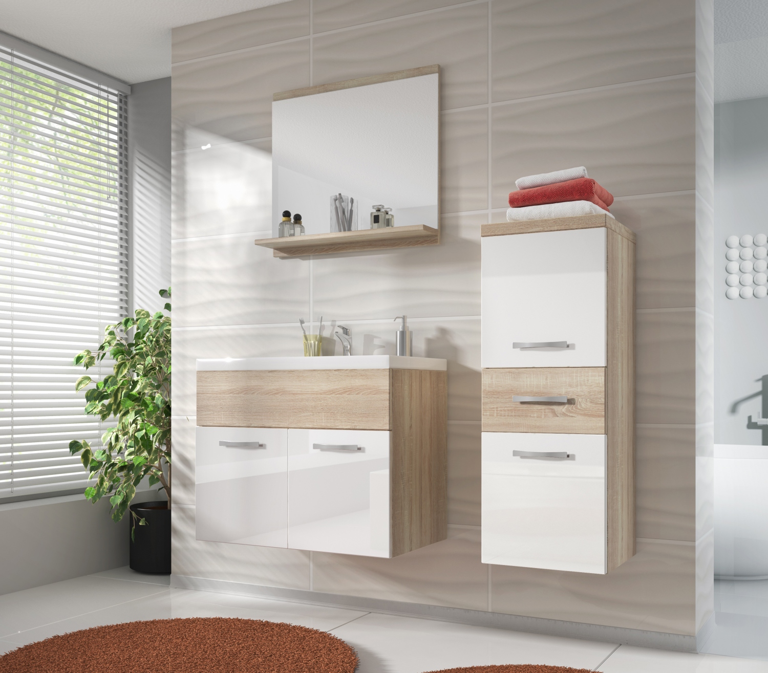 Nedostatek úložného prostoru je již minulostí. Součástí sestavy je střední závěsná skříňka, jež vám dává k dispozici tři pojízdné zásuvky. Za dvoudveřové otvírání skříňky pod umyvadlo snadno schováte desinfekční i čistící prostředky. Zvolte si variantu s umyvadlem nebo bez něj. Ozdobou celé koupelny bude praktické závěsné zrcadlo s poličkou.