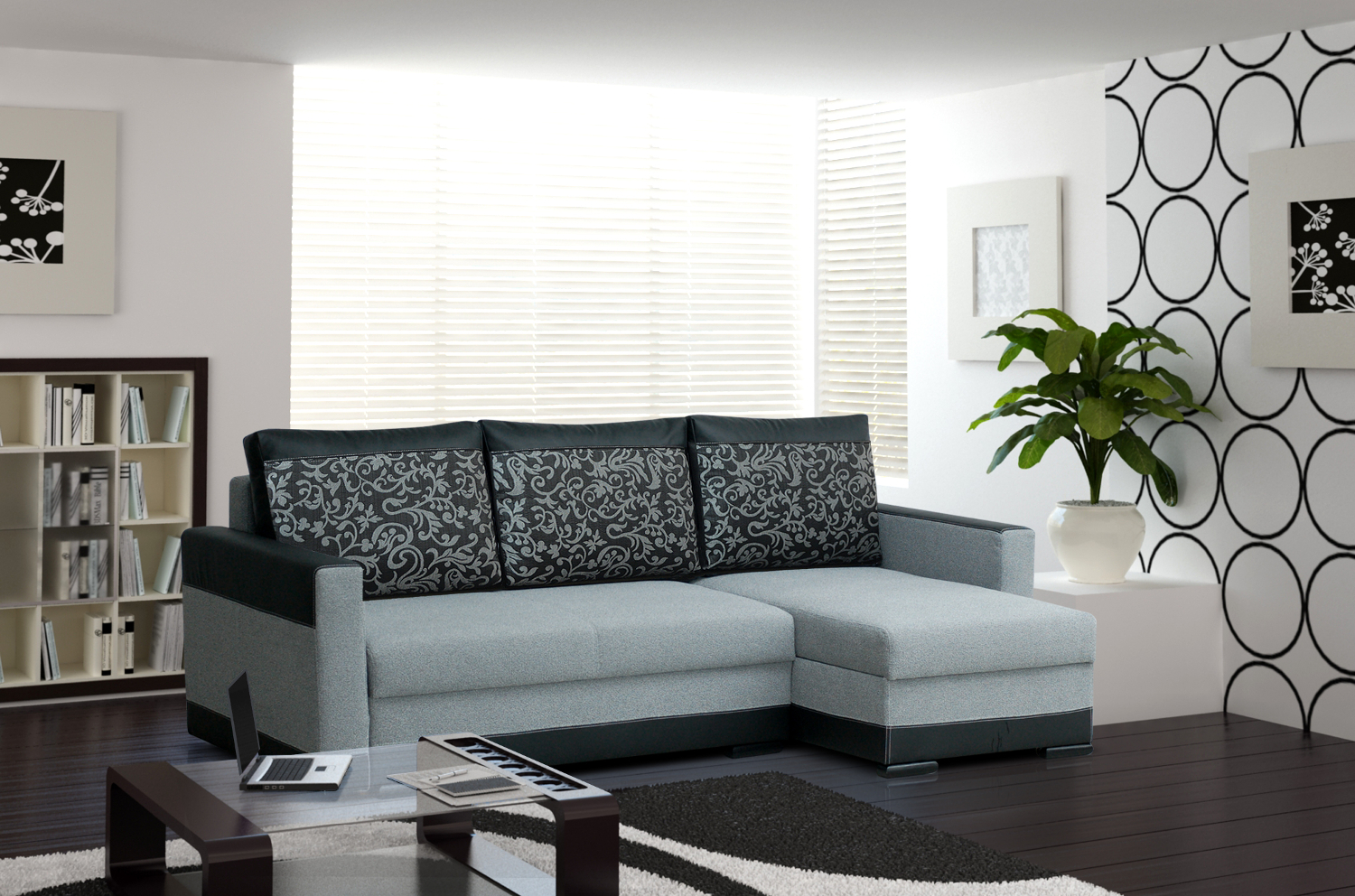 Sedací souprava je kombinací dvou druhů čalounů. Světlejší části jsou vyvedeny v šedé potahové látce. Klasická látka je použita i na vzorovanou část polštářů. Tmavé prvky tvoří černá ekokůže, která působí luxusním dojmem.