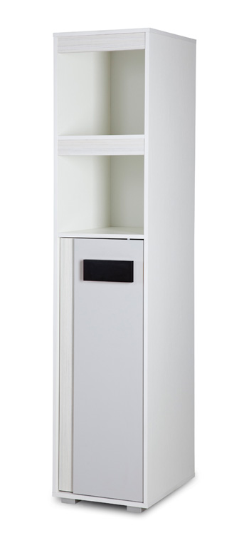 Moderní regál Riki je jako všechny výrobky ze stejnojmenné kolekce vyveden v barevné kombinaci bílé borovice a šedé. Horní část je otevřená a rozdělena policí na dvě poloviny. Ve spodní uzavřené skříňce se nacházejí dvě police. Dvířka jsou opatřena černou obdélníkovou úchytkou.
