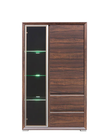 Vitrína má v prosklené části 3 vložené skleněné police, které můžete zvýraznit LED osvětlením. Pevná část má skříňku s plnými dvířky, jež osbahuje 1 polici. Ve spodní části jsou 2 praktické šuplíky na válečkových kolejničkách.