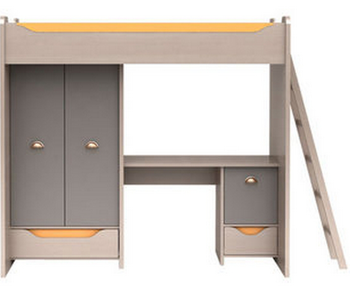 Máte malý byt a ještě menší dětský pokojíček? Využijte každičké místo. To se vám povede díky pořízení patrové postele Orango, pod níž je skříň s praktickou šatní tyčí a zásuvkou. Dalším užitečným prvkem je psací stůl se skříňkou s 1 policí a také se zásuvkou na válečkových kolejničkách.