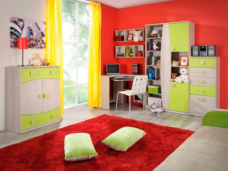 Barevný dětský pokoj nevšedního designu oživí každý interiér. Celá sestava nabízí kombinovanou komodu s šuplíky, praktický rohový PC stůl, knihovnu, šatní skříň s policemi, šuplíkovou komodu a dvě závěsné police k ukládání dekorací. Kvalitní řemeslné zpracování zaručí spokojenost zákazníka. Vybírat je možno ze tří atraktivních odstínů.