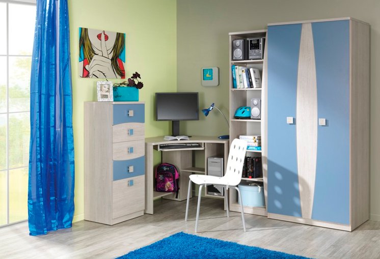 Moderní dětská nábytková sestava vhodná i do menších prostorů. Jednotlivé díly lze lehce kombinovat. Dětský pokoj tvoří velká dvoudveřová skříň s policemi a jednou tyčí, knihovna, praktický rohový PC stůl s pojizdnou deskou na klávesnici a šuplíková komoda. Celá sestava ač malých rozměrů nabízí k využití spoustu úložných prostorů. Precizní řemeslné zpracování a kvalitní materiál zaručí dlouhodobé užívání.