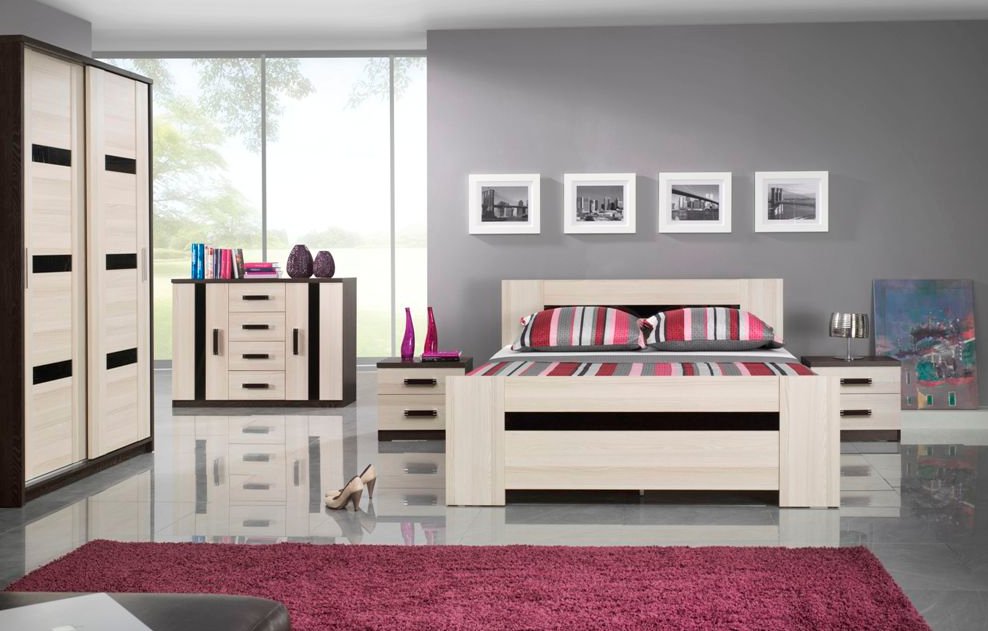 Moderní sestava nábytku do ložnice s několika praktickými komponenty. Ložnice je dodávána v sestavě jako je na obrázku. Součástí je šatní skříň s posuvnými dveřmi, manželská postel s úložným šuplíkem, dva noční stolky na odkládání a kombinovaná komoda. Celá sestava je vyrobena z kvalitního materiálu, který je nenáročný na údržbu.